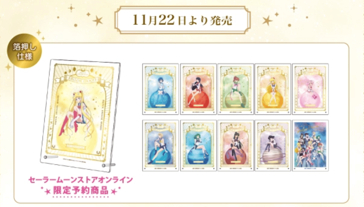 Sailor Moon store exclusive Sailor Moon 30th anniversary acrylic art board. A gorgeous A4 size acrylic art board with gold foil stamping on the frame design and logo. There are 11 designs to choose from. They will definitely have some nice weight to them, and great for interior decorating.