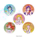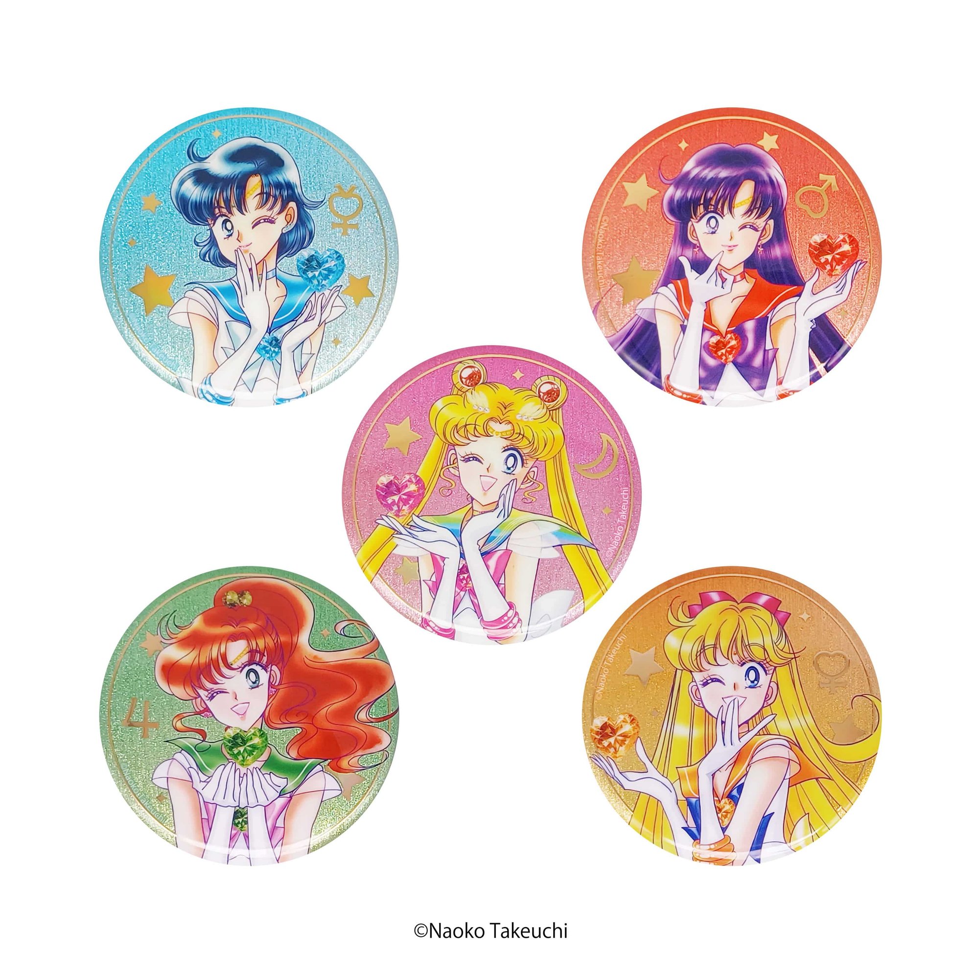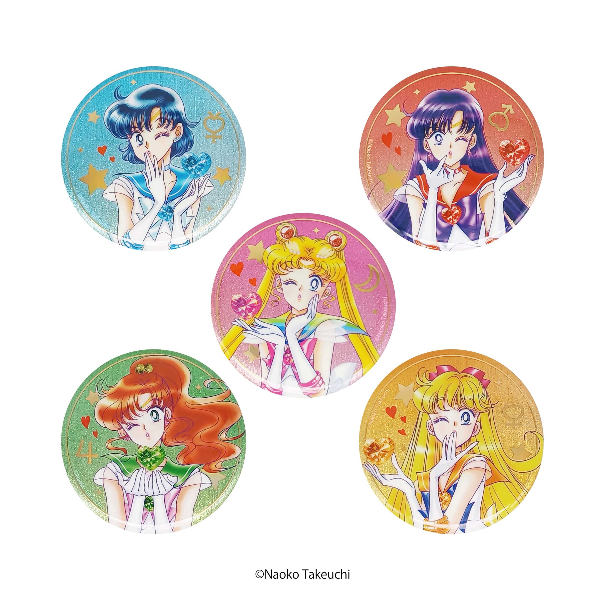 This aurora glitter pin badge has a striking presence thanks to its sparkling glitter background and aurora foil-stamped pattern. Please choose from "Smiling Set" or "Kiss Set". You will receive all five for each available set.