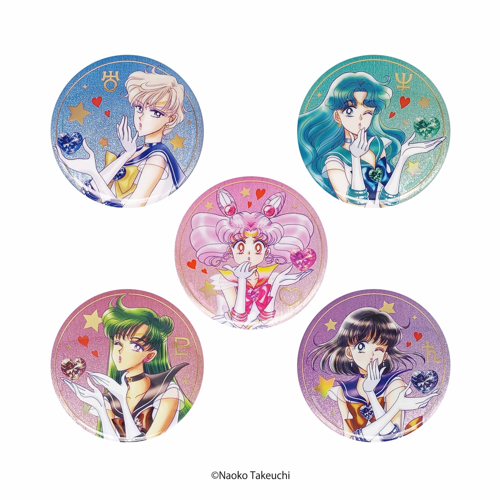 This aurora glitter pin badge has a striking presence thanks to its sparkling glitter background and aurora foil-stamped pattern. Please choose from "Smiling Set" or "Kiss Set". You will receive all five for each available set.