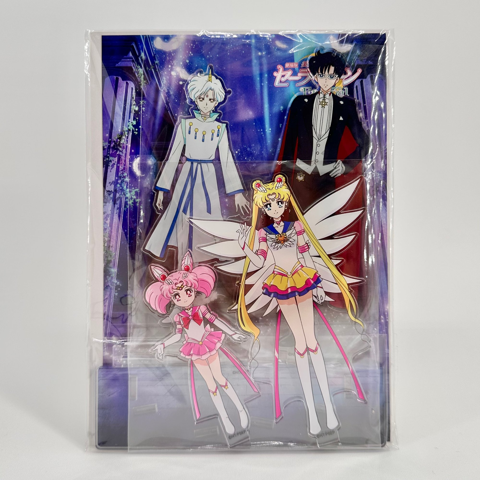 Rare and brand new Sailor Moon Eternal movie theater limited diorama acrylic stand set featuring Eternal Sailor Moon, Eternal Sailor Chibi Moon, Tuexdo Mask, and Helios. All characters can be attached to the stand with provided background image to create a diorama scene.