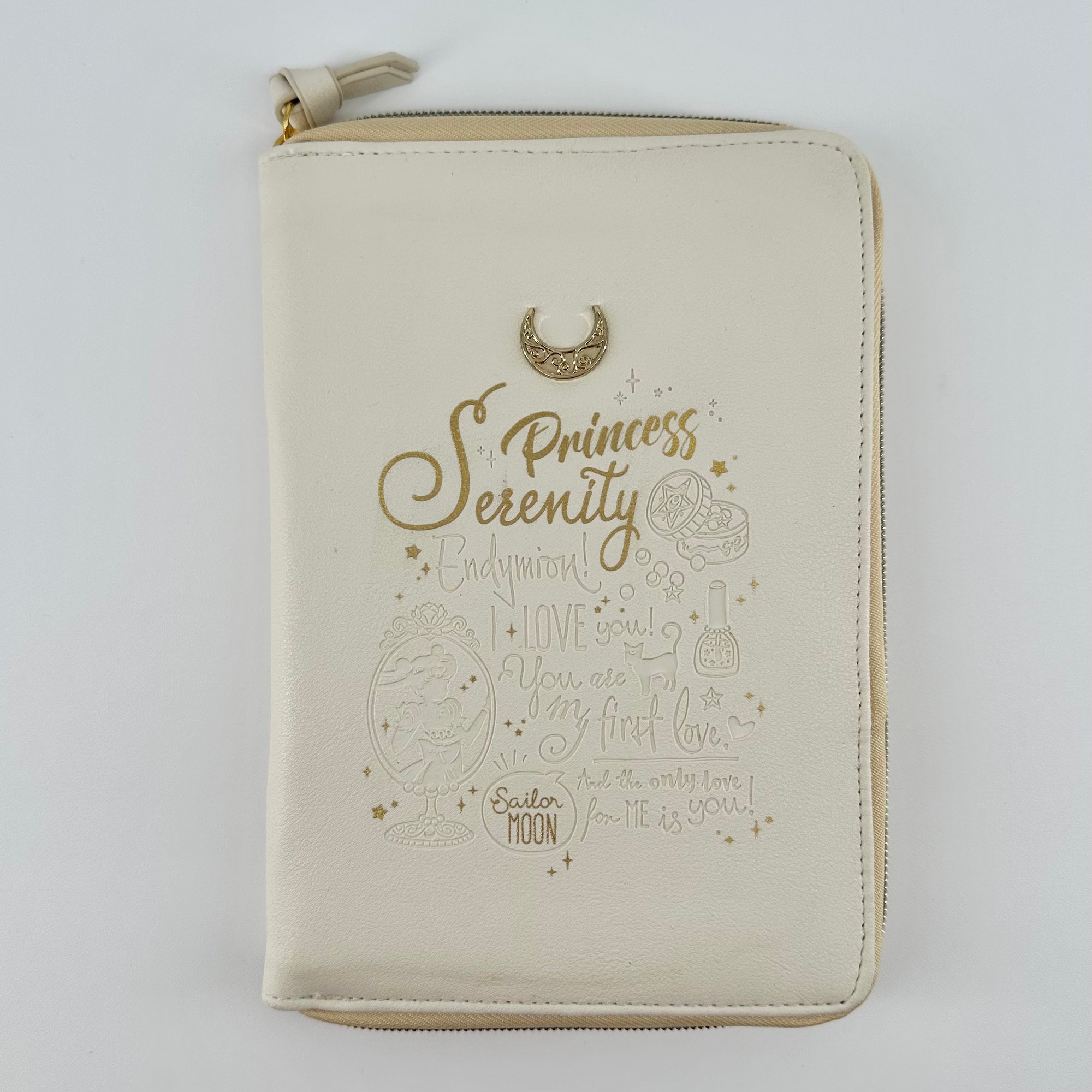 This is a beautiful Sailor Moon x Sun-Star Monthly planner with case. It is inspired by Princess Serenity, so any images and icons are related to the character. There's a lovely crescent moon embellishment on the cover. The planner itself is from 2018, but never used. The planner booklet is removable, so you can put in your own notebook or planner year after year. This item is hard to find, and no longer in production.
