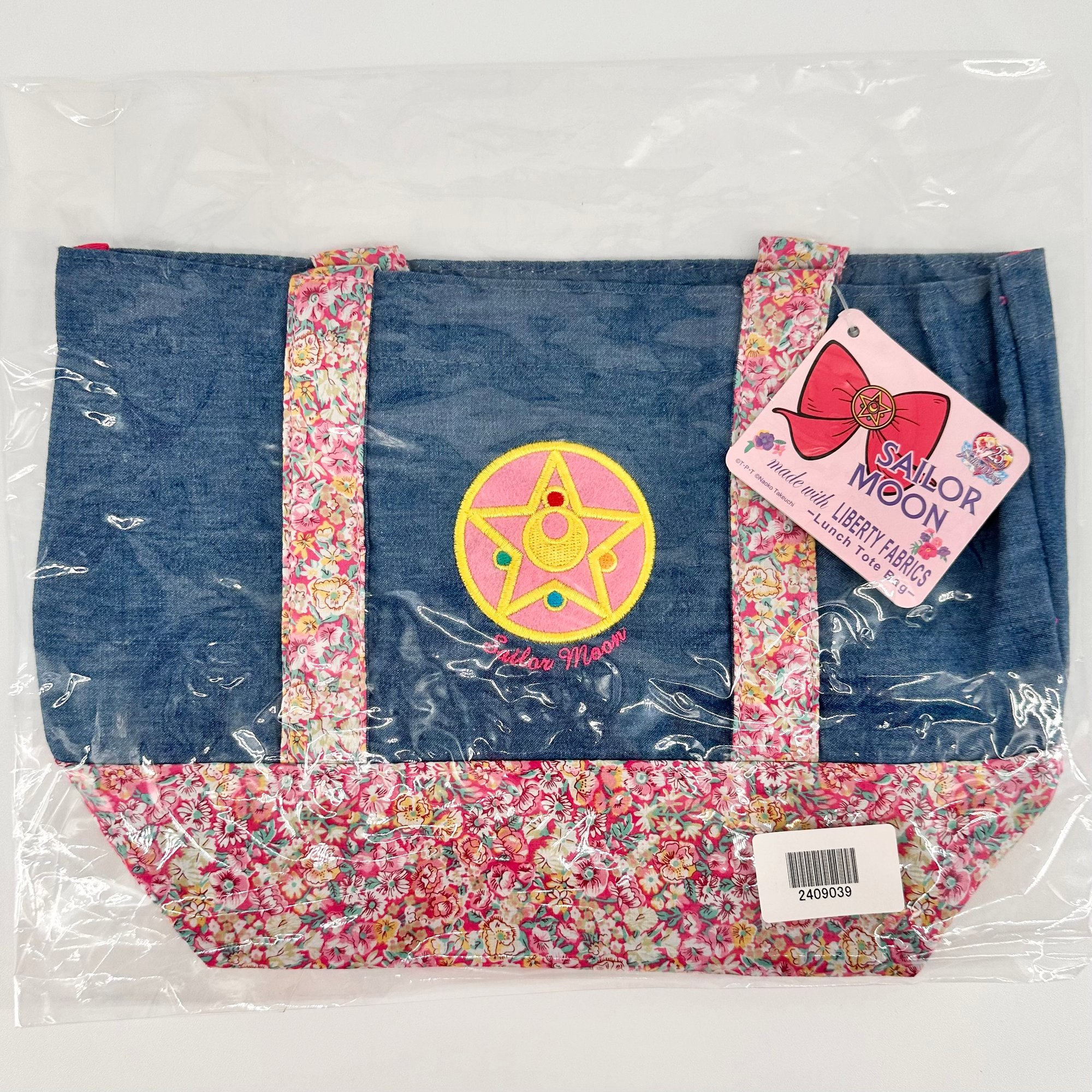 Very rare Sailor Moon x Liberty Fabrics lunch tote bag. Beautiful floral pattern with denim and embroidery of the Crystal Star compact. This is part of the Sailor Moon 25th anniversary release, and in very limited quantities. Great collectors item, and in brand new condition.